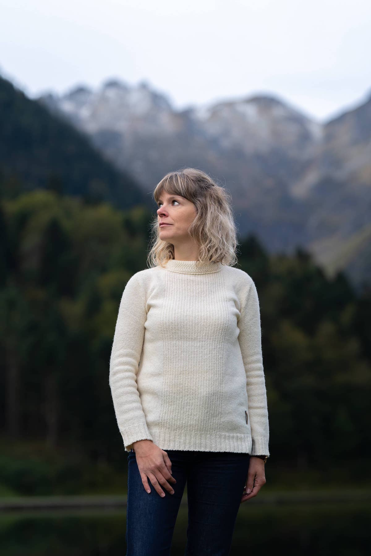 EcruAuthentic and casual, this ecru white sweater, in blended Pyrenean wool, is warm, soft, comfortable and breathable. Its round neck with hand-knitted bias recalls its mountain side. It will be your ideal companion for mid-season and winter.